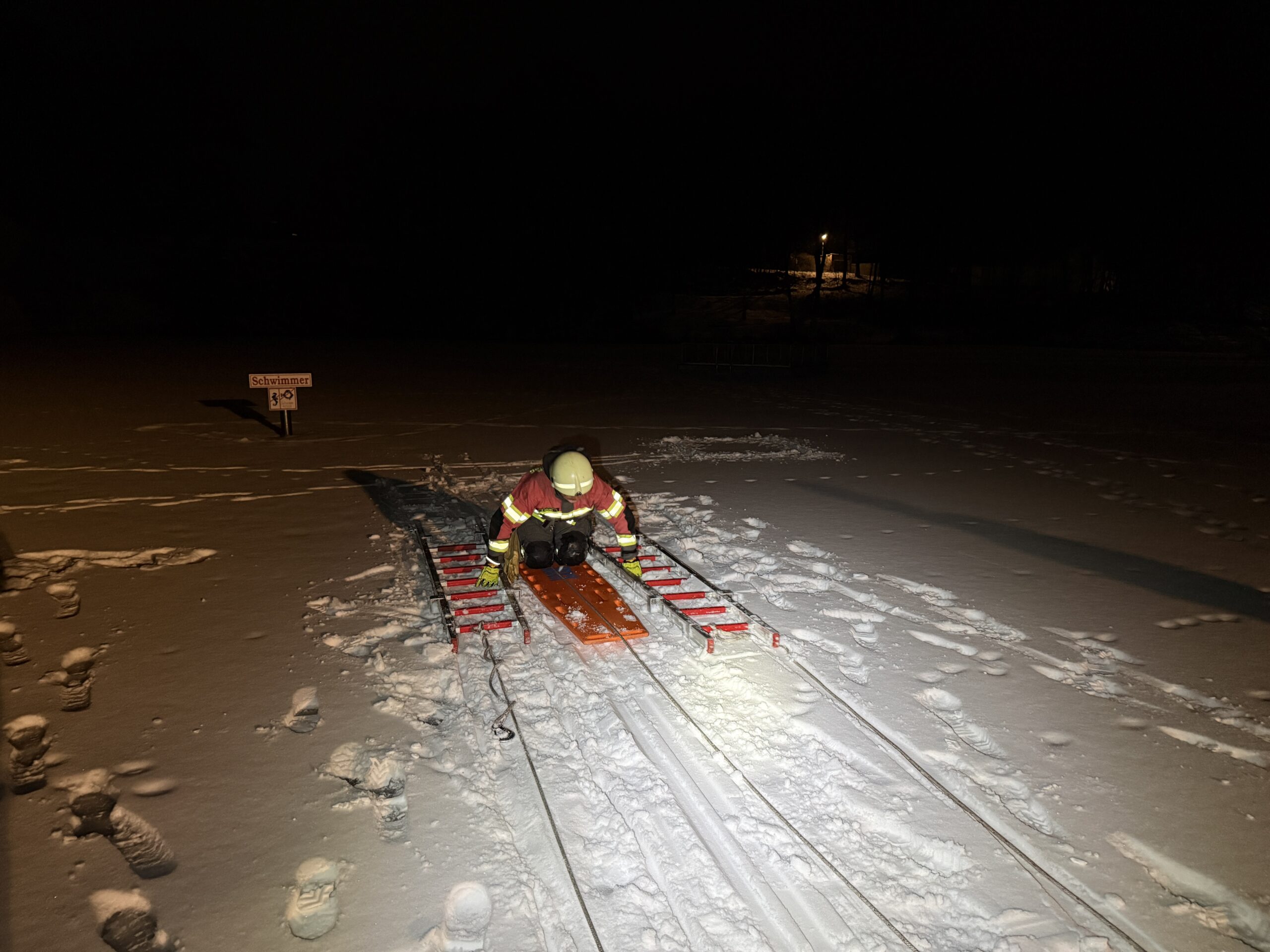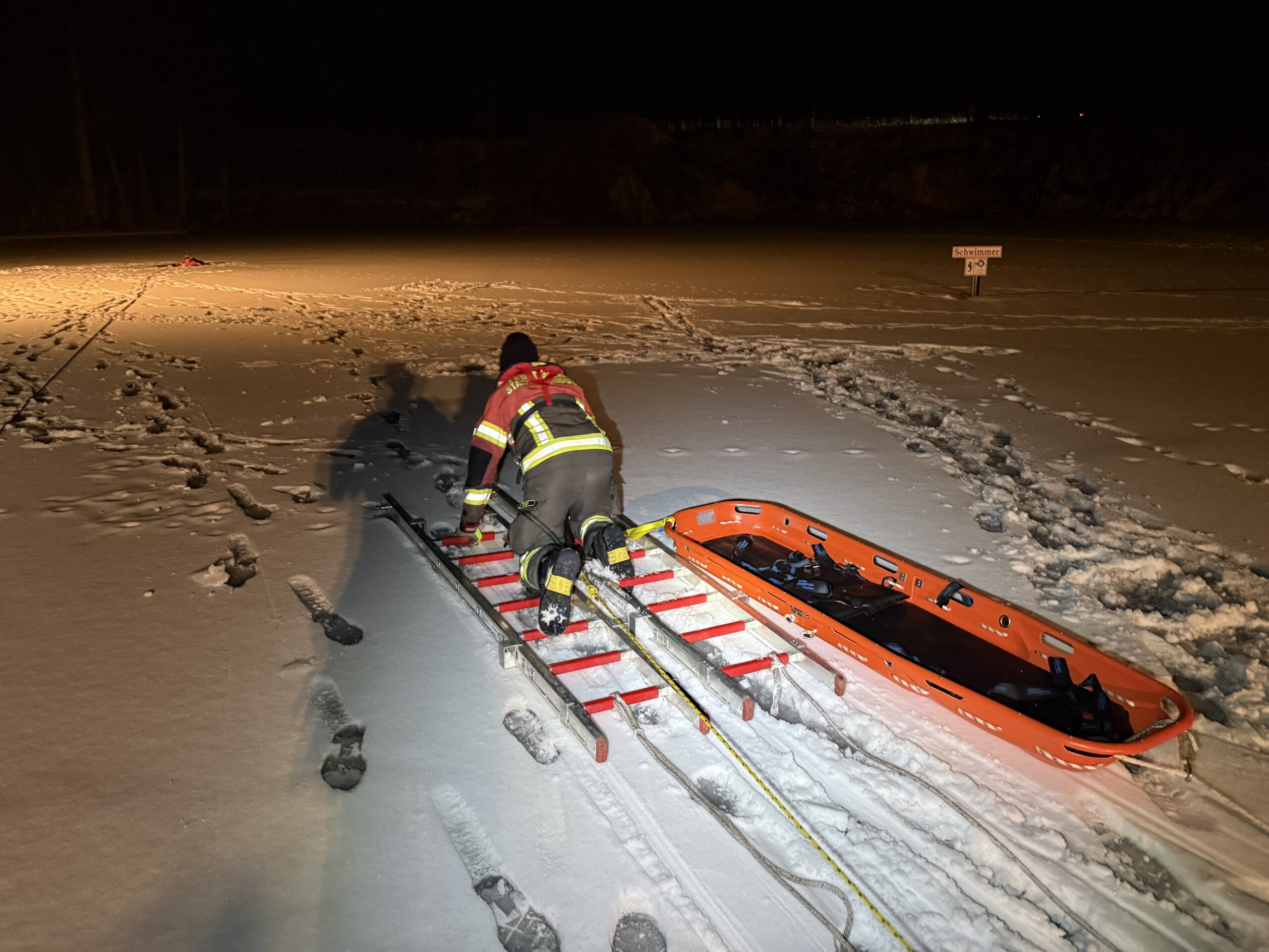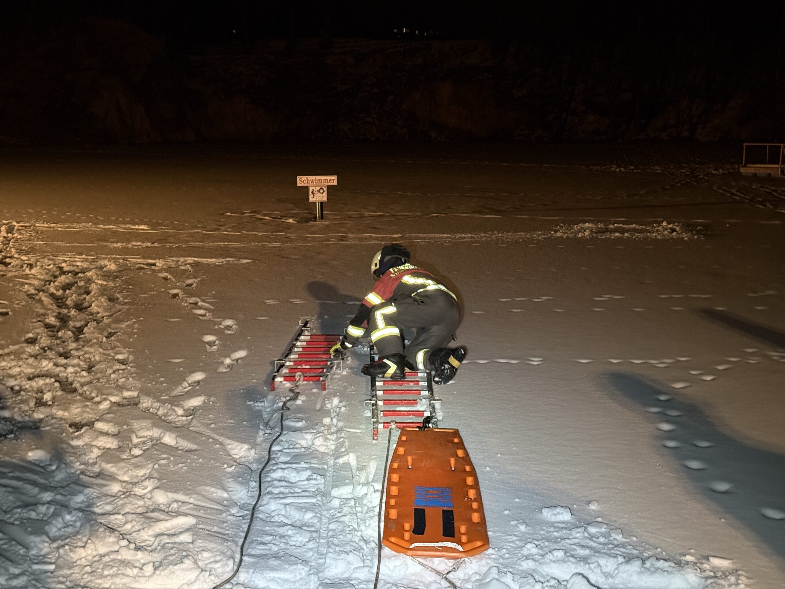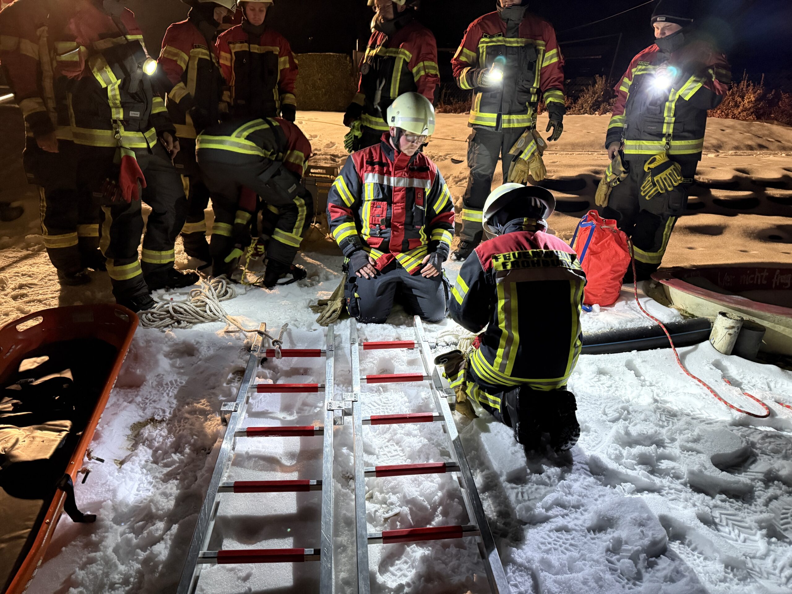 🧊 Im anschließenden praktischen Teil wurden verschiedene Einsatzszenarien und Rettungsvarianten trainiert. Dabei kamen unter anderem das Spineboard, die Schleifkorbtrage sowie Steckleiterteile zum Einsatz. Ein besonderer Schwerpunkt lag auf der Sicherung der rettenden Person sowie dem fachgerechten Einbinden der eingesetzten Rettungsmittel in den gesamten Rettungsablauf.
