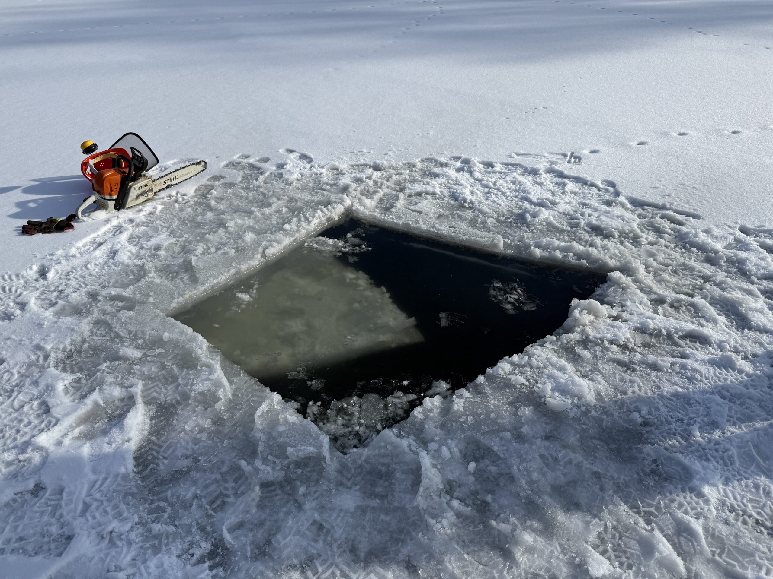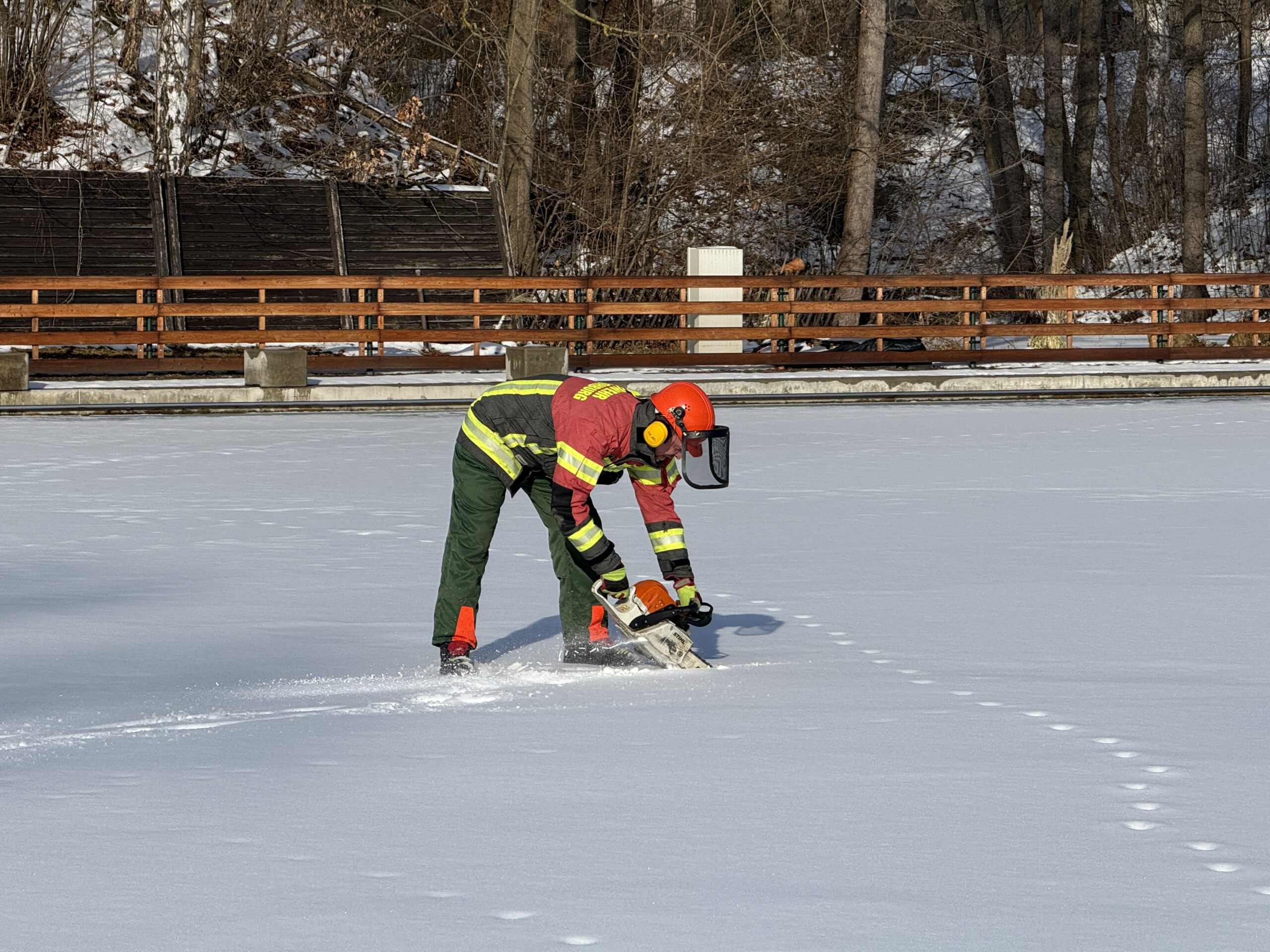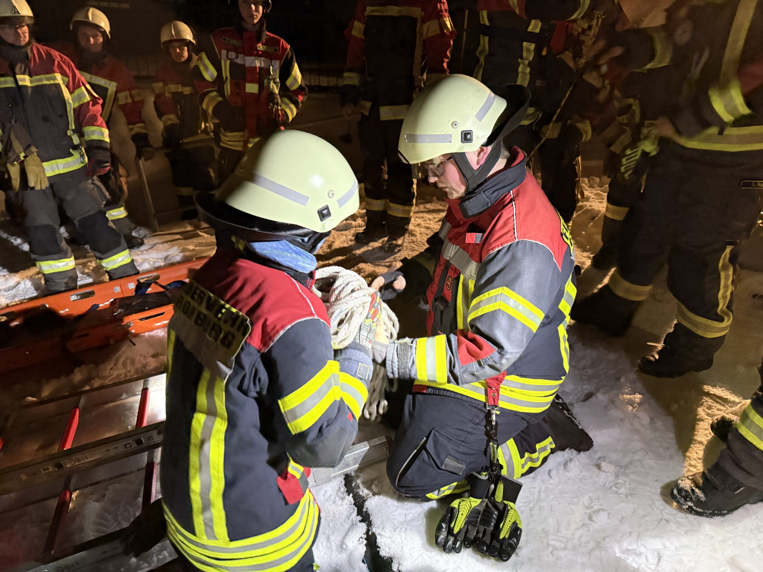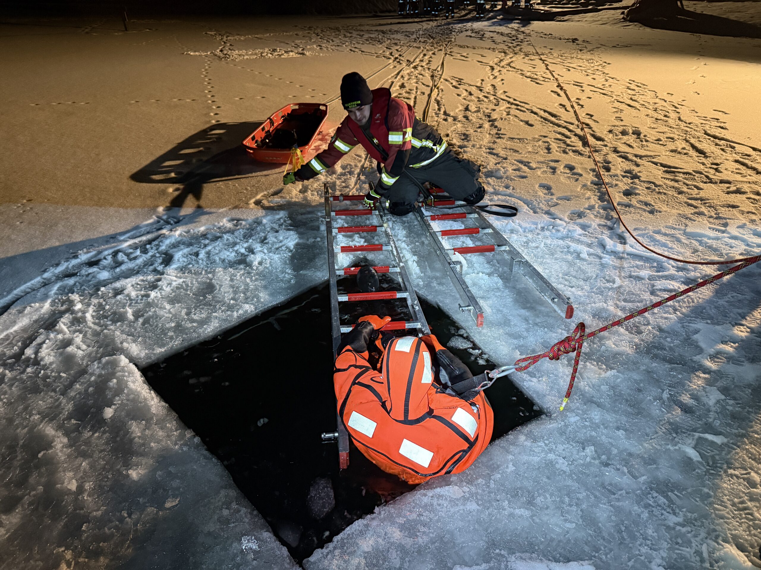🧊 Im anschließenden praktischen Teil wurden verschiedene Einsatzszenarien und Rettungsvarianten trainiert. Dabei kamen unter anderem das Spineboard, die Schleifkorbtrage sowie Steckleiterteile zum Einsatz. Ein besonderer Schwerpunkt lag auf der Sicherung der rettenden Person sowie dem fachgerechten Einbinden der eingesetzten Rettungsmittel in den gesamten Rettungsablauf.