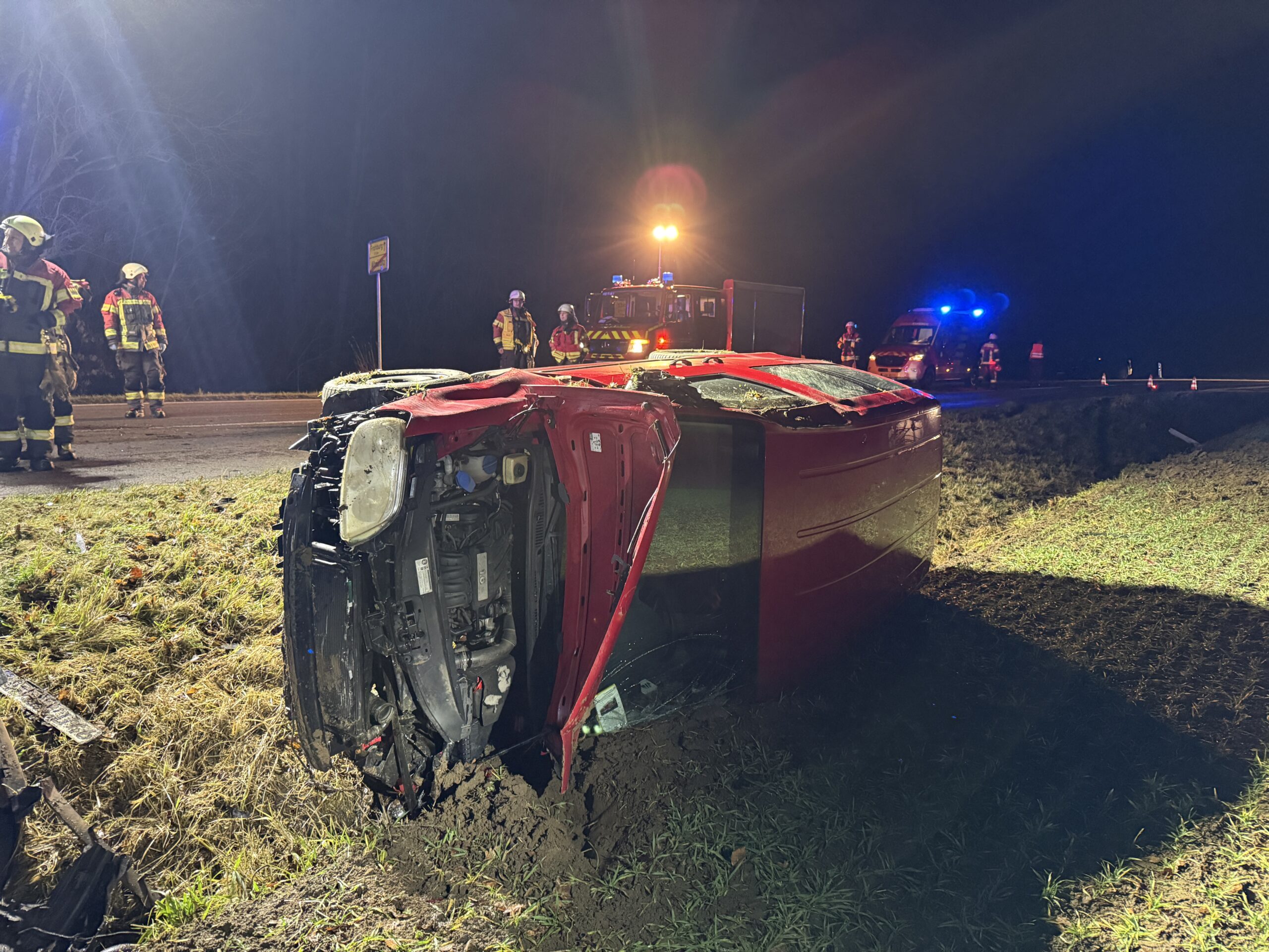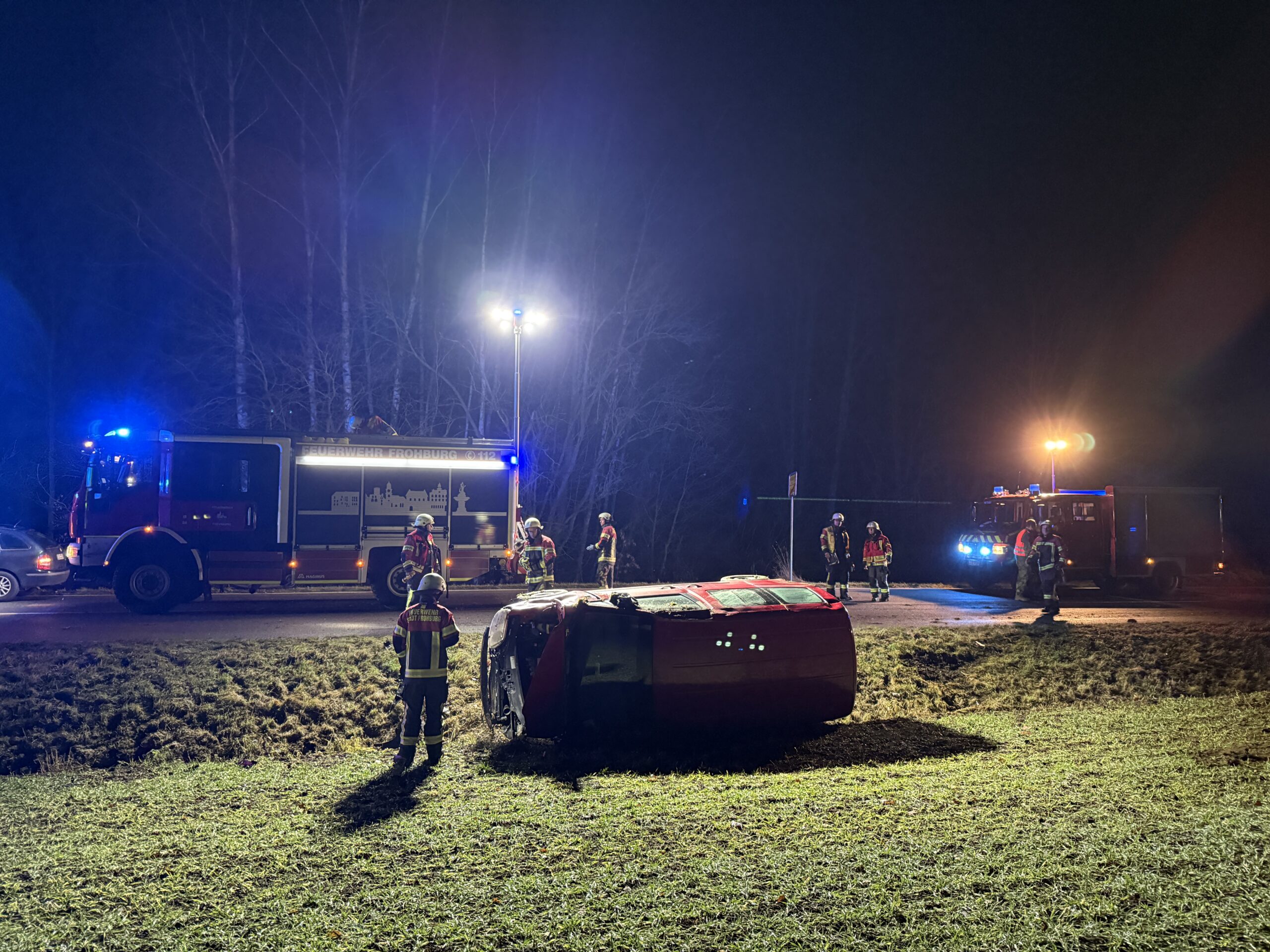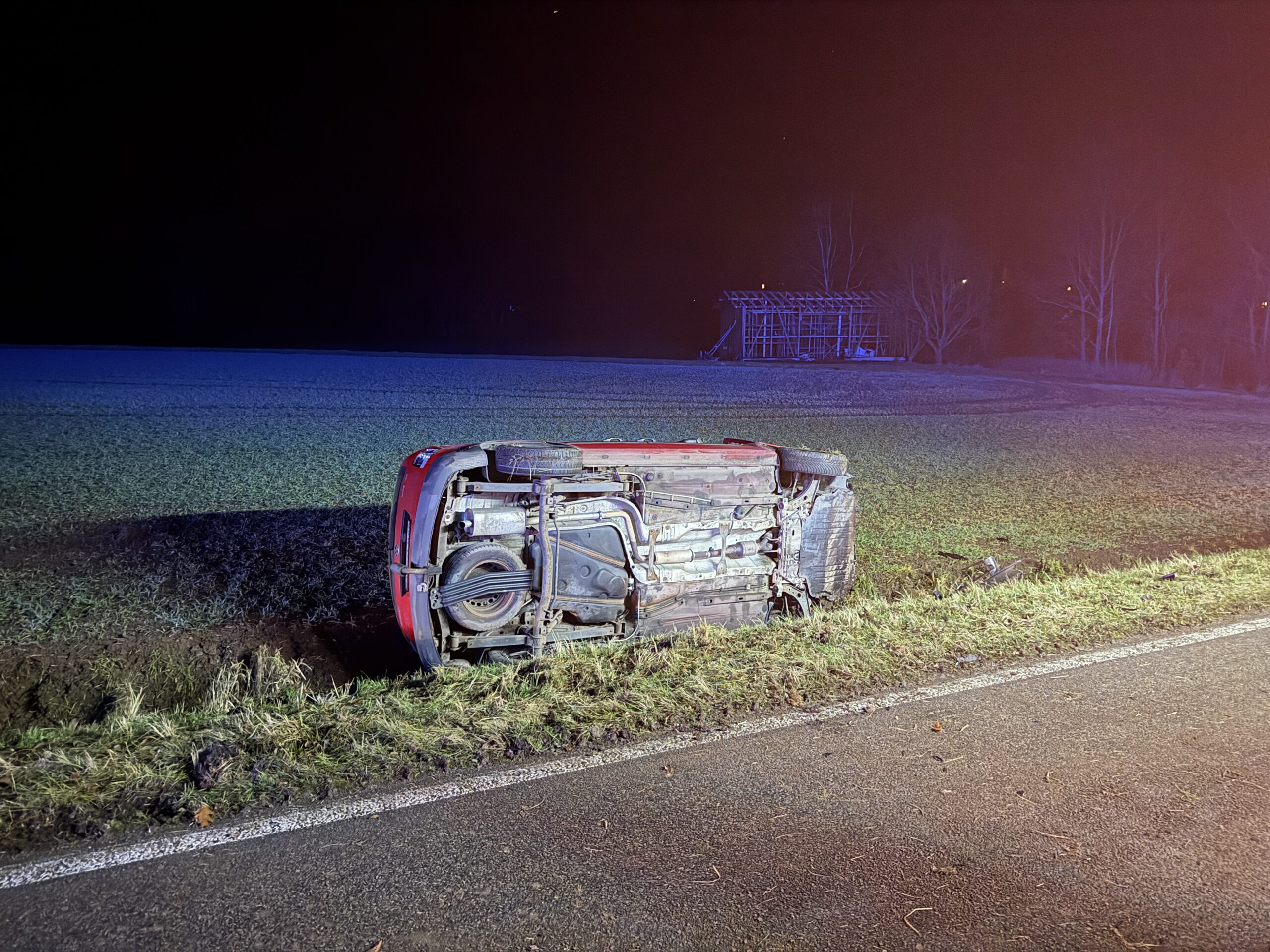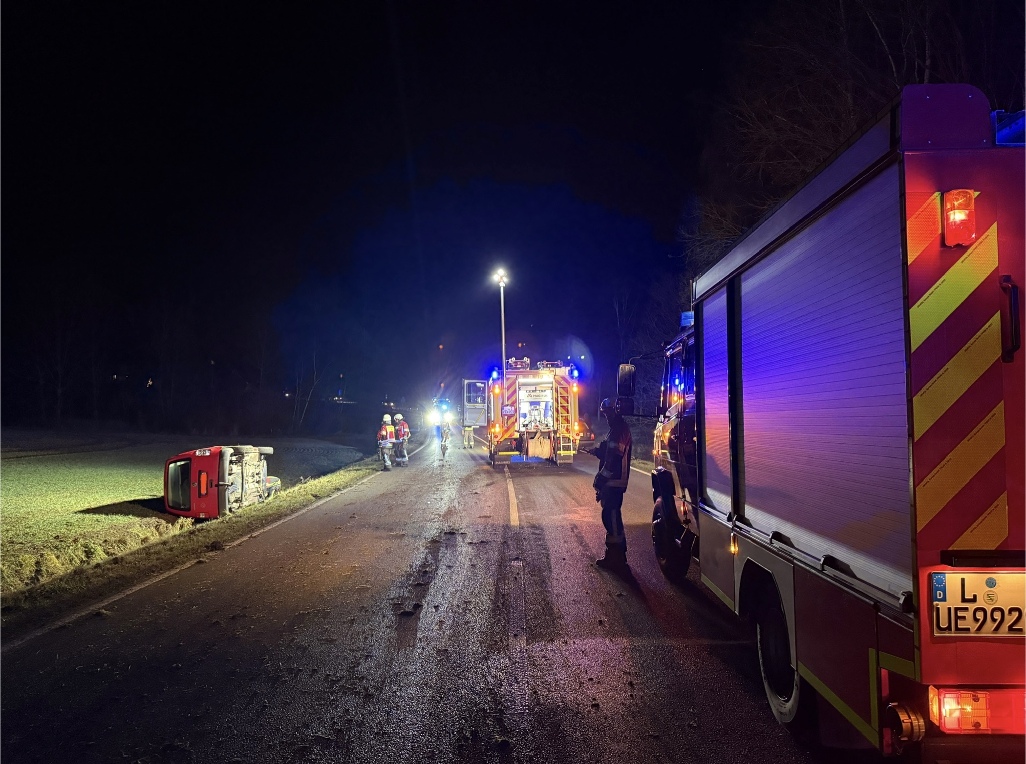 Heute Früh kam es auf der S51 bei Altmörbitz zu einem schweren Verkehrsunfall. Ein PKW hatte sich überschlagen und kam in Seitenlage im Straßengraben zum Stillstand. Entgegen der Erstmeldung war keine Person mehr eingeklemmt, der Fahrer konnte sich noch vor Eintreffen der Feuerwehr selbst aus seinem Fahrzeug befreien und wurde anschließend an den Rettungsdienst übergeben. Wir sicherten die Einsatzstelle gegen den fließenden Verkehr, leuchteten die Unfallstelle aus und nahmen auslaufende Betriebsstoffe auf. Während der Einsatzmaßnahmen war die S51 voll gesperrt. Nach Abschluss aller Maßnahmen wurde die Einsatzstelle nach etwa einer Stunde an die Polizei übergeben.