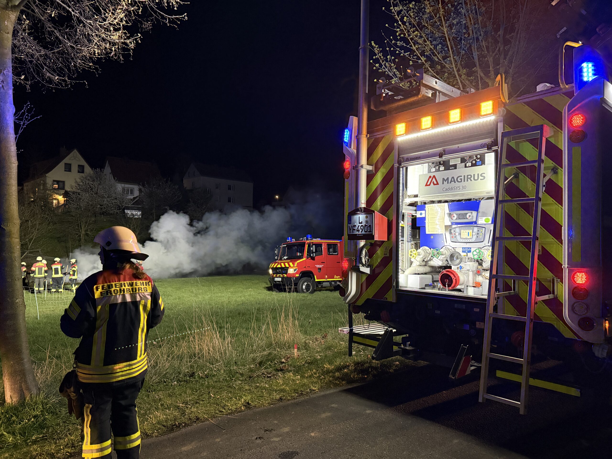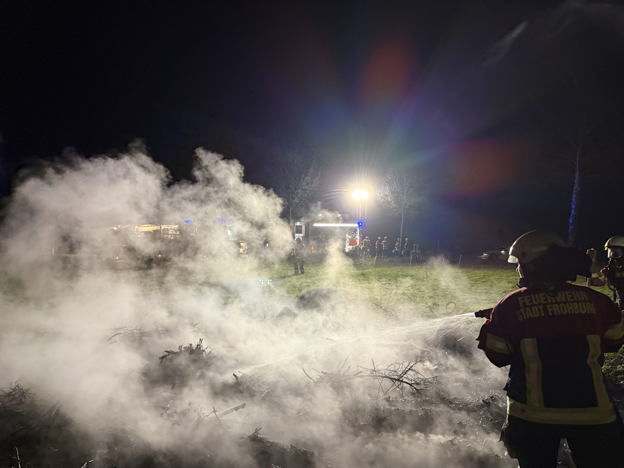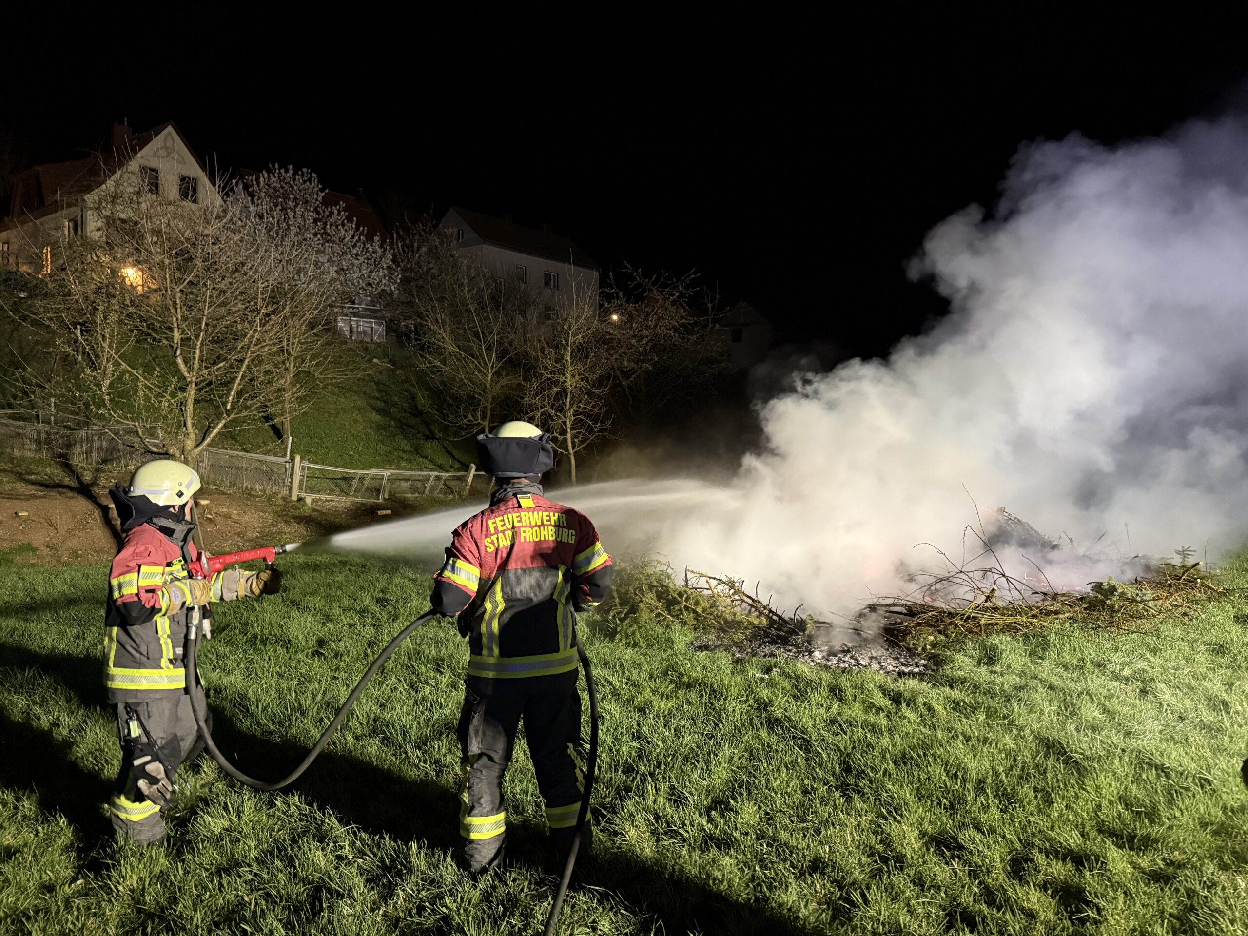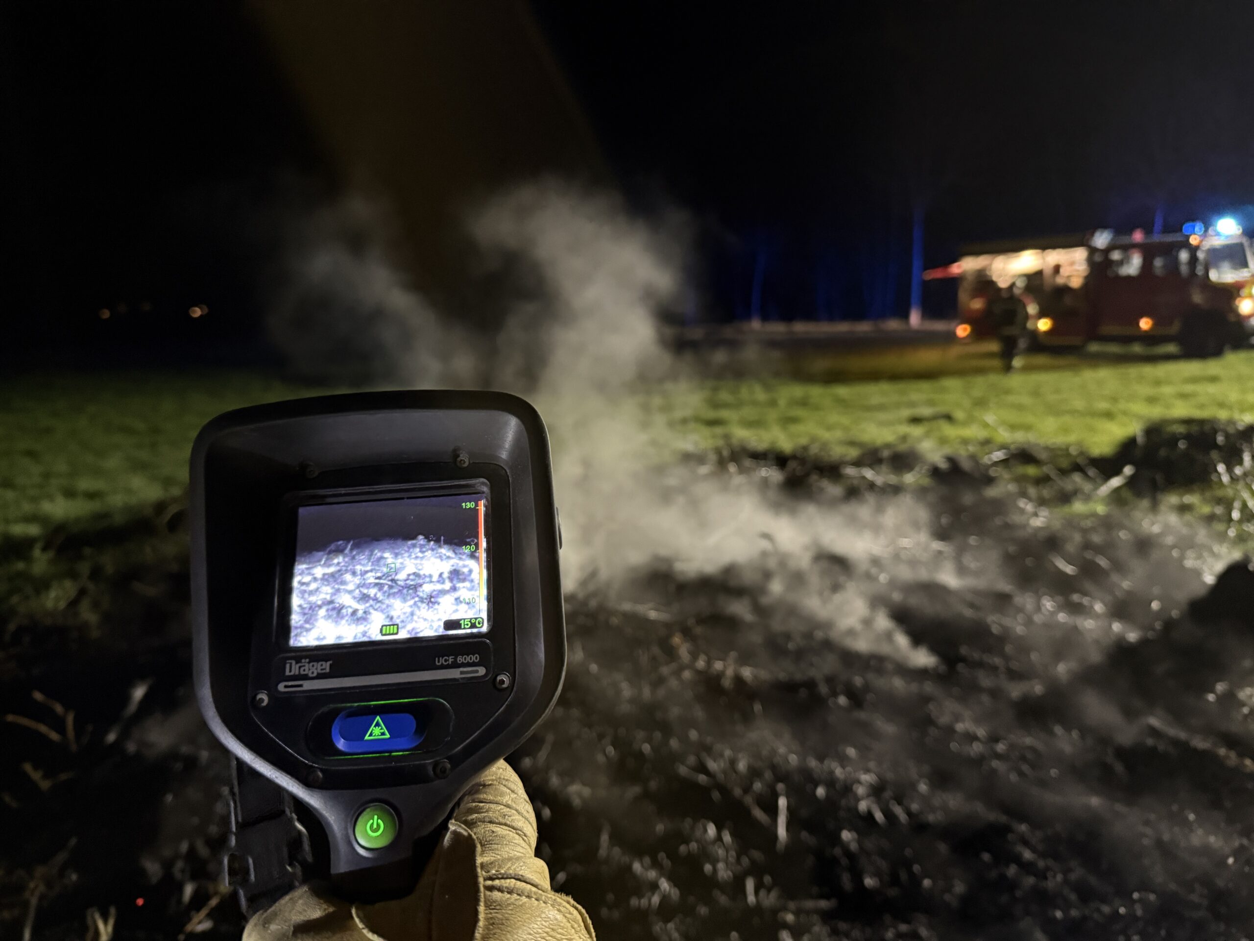 Datum/Uhrzeit: Einsatzort: Einsatzleiter: Kräfte und Mittel: Weitere Kräfte: Bericht: Gemeldet wurde ein Brand im Bereich des alten Wasserwerks zwischen den Ortslagen Frohburg und Greifenhain. Vor Ort bestätigte sich die gemeldete Lage jedoch nur teilweise. Es brannte ein etwa 100 m² großer Haufen aus Unrat und Grünschnitt auf einer angrenzenden Wiese. Die Brandbekämpfung wurde umgehend mittels Hochdruckeinrichtung des Mittleren Löschfahrzeugs (MLF) eingeleitet. Parallel dazu ging ein Trupp des Hilfeleistungslöschgruppenfahrzeugs (HLF) unter schwerem Atemschutz vor. Mithilfe von Dunggabeln und Waldbrandhacken wurde das Brandgut auseinandergezogen und gezielt abgelöscht. Im weiteren Einsatzverlauf wurde die Brandstelle mit einer Wärmebildkamera kontrolliert. Dabei wurden Glutnester festgestellt, die sich bereits tiefer in das Erdreich ausgebreitet hatten. Entsprechend erfolgten umfangreiche Nachlöscharbeiten sowie eine zusätzliche Aufarbeitung des betroffenen Bodens. Zur Sicherstellung der Einsatzstellenhygiene wurde ein separater Ablageplatz für kontaminiertes Material eingerichtet. Zudem wurden die eingesetzten Trupps sowie deren verschmutzte und kontaminierte Schutzkleidung gesammelt und fachgerecht verpackt, um eine Verschleppung von Schadstoffen zu verhindern. Nach Abschluss aller Maßnahmen wurde die Einsatzstelle an die Polizei übergeben.