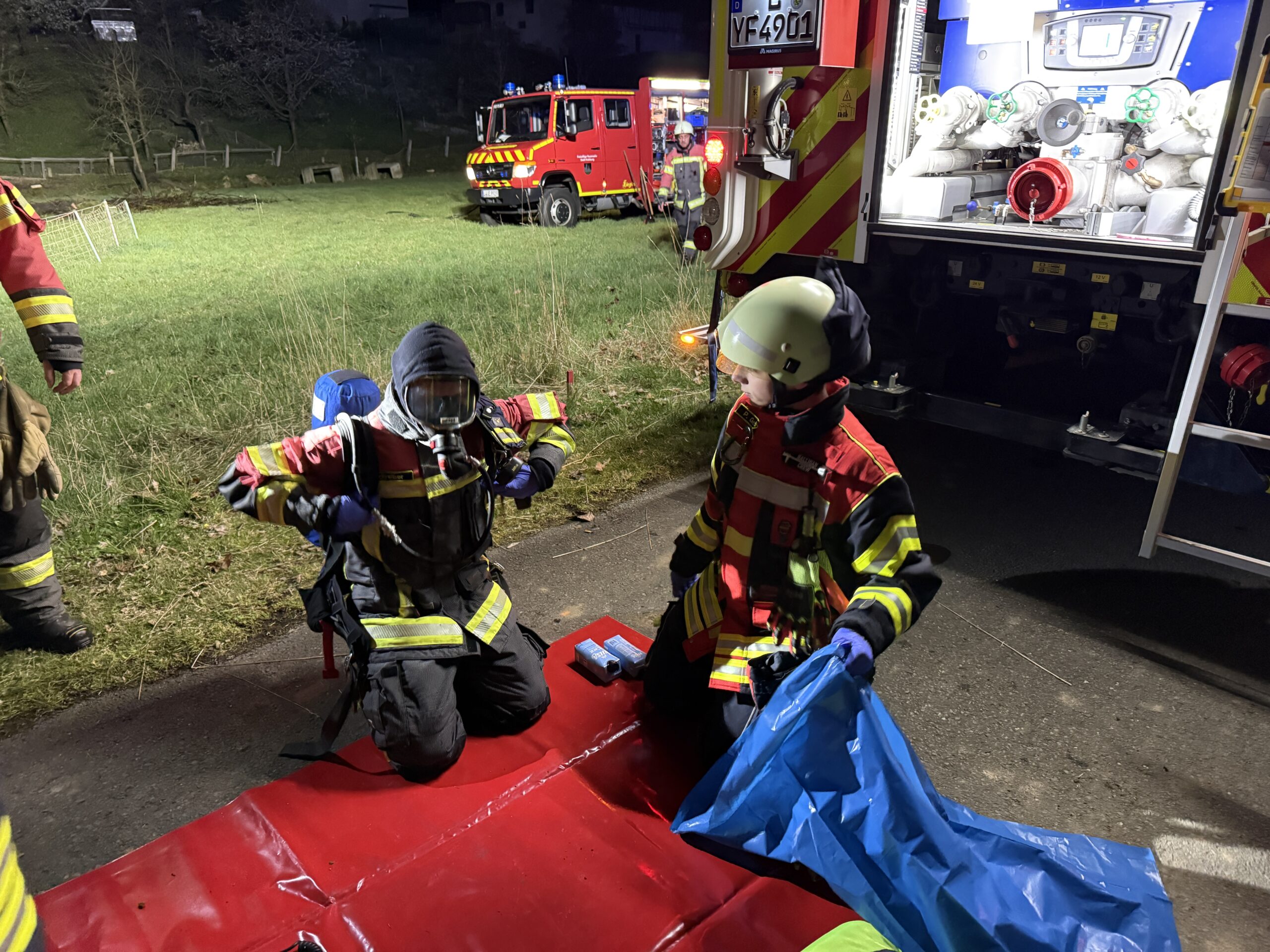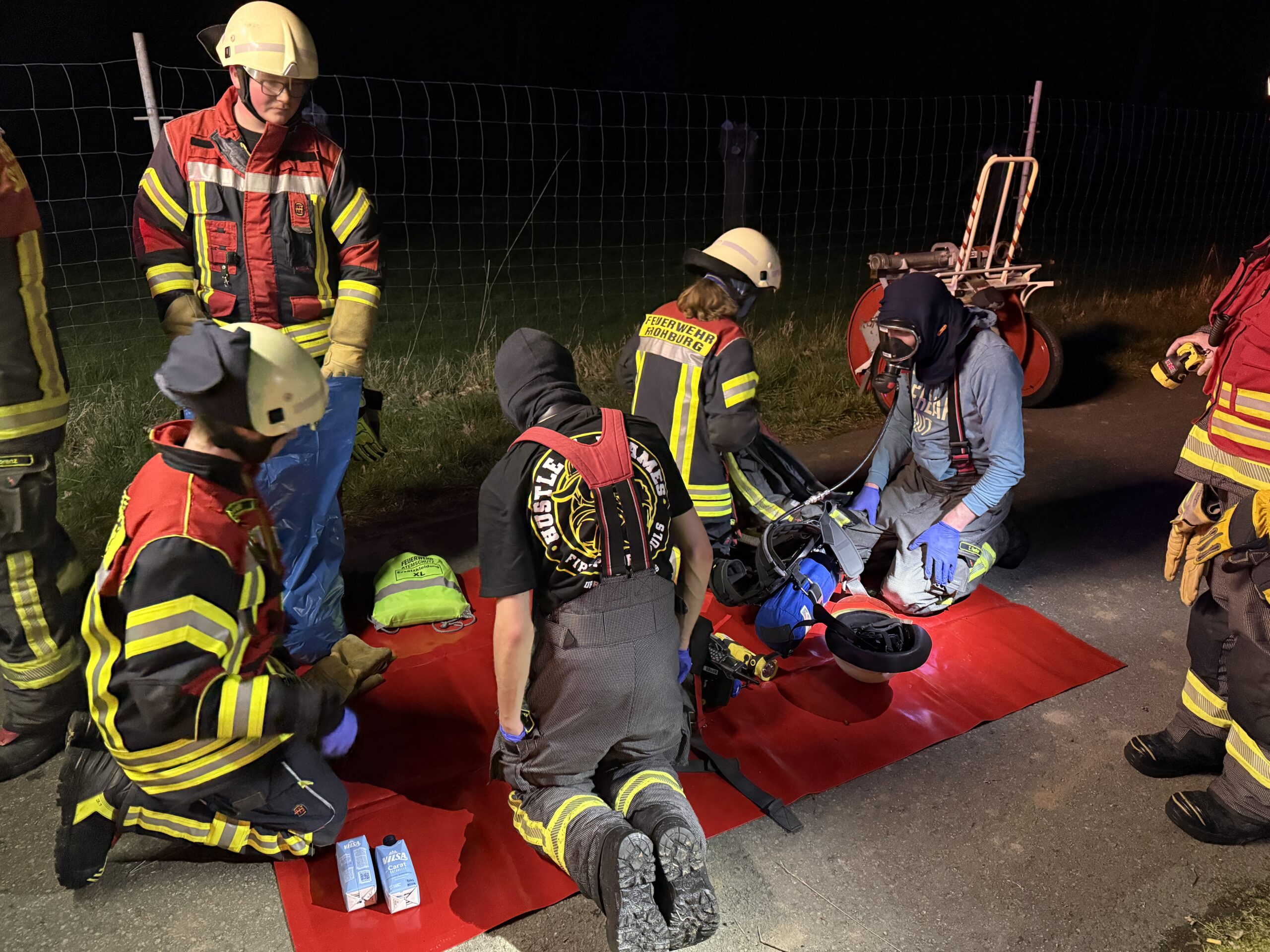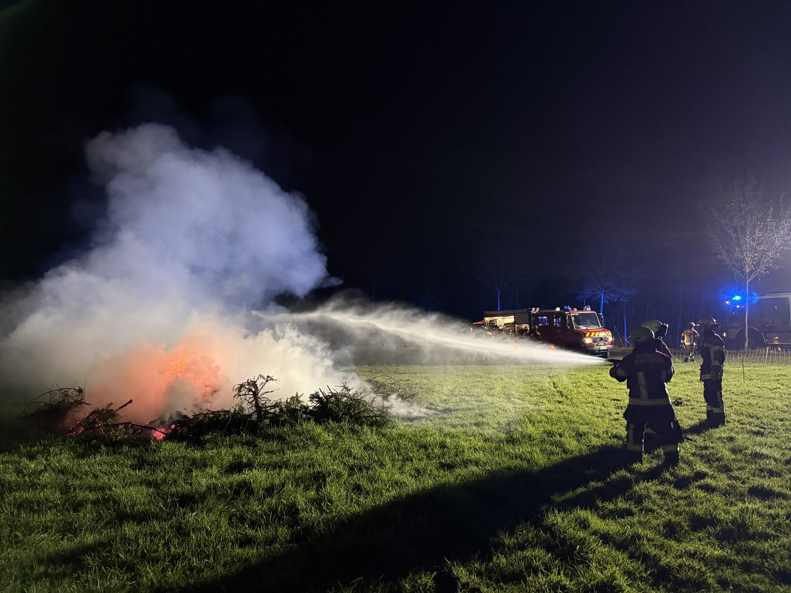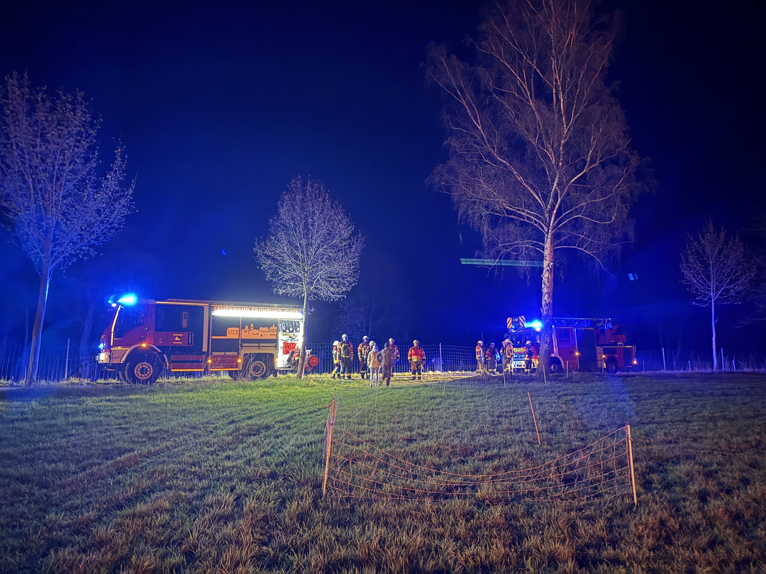 Datum/Uhrzeit: Einsatzort: Einsatzleiter: Kräfte und Mittel: Weitere Kräfte: Bericht: Gemeldet wurde ein Brand im Bereich des alten Wasserwerks zwischen den Ortslagen Frohburg und Greifenhain. Vor Ort bestätigte sich die gemeldete Lage jedoch nur teilweise. Es brannte ein etwa 100 m² großer Haufen aus Unrat und Grünschnitt auf einer angrenzenden Wiese. Die Brandbekämpfung wurde umgehend mittels Hochdruckeinrichtung des Mittleren Löschfahrzeugs (MLF) eingeleitet. Parallel dazu ging ein Trupp des Hilfeleistungslöschgruppenfahrzeugs (HLF) unter schwerem Atemschutz vor. Mithilfe von Dunggabeln und Waldbrandhacken wurde das Brandgut auseinandergezogen und gezielt abgelöscht. Im weiteren Einsatzverlauf wurde die Brandstelle mit einer Wärmebildkamera kontrolliert. Dabei wurden Glutnester festgestellt, die sich bereits tiefer in das Erdreich ausgebreitet hatten. Entsprechend erfolgten umfangreiche Nachlöscharbeiten sowie eine zusätzliche Aufarbeitung des betroffenen Bodens. Zur Sicherstellung der Einsatzstellenhygiene wurde ein separater Ablageplatz für kontaminiertes Material eingerichtet. Zudem wurden die eingesetzten Trupps sowie deren verschmutzte und kontaminierte Schutzkleidung gesammelt und fachgerecht verpackt, um eine Verschleppung von Schadstoffen zu verhindern. Nach Abschluss aller Maßnahmen wurde die Einsatzstelle an die Polizei übergeben.