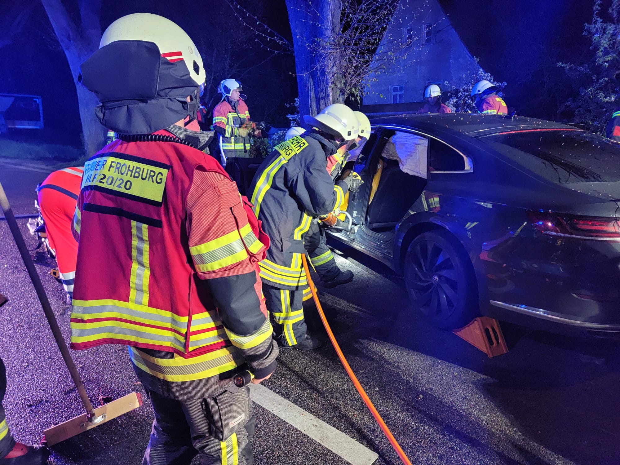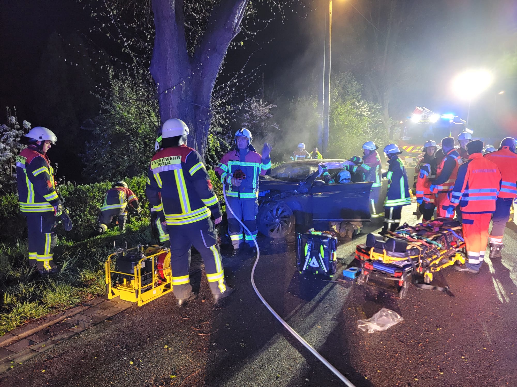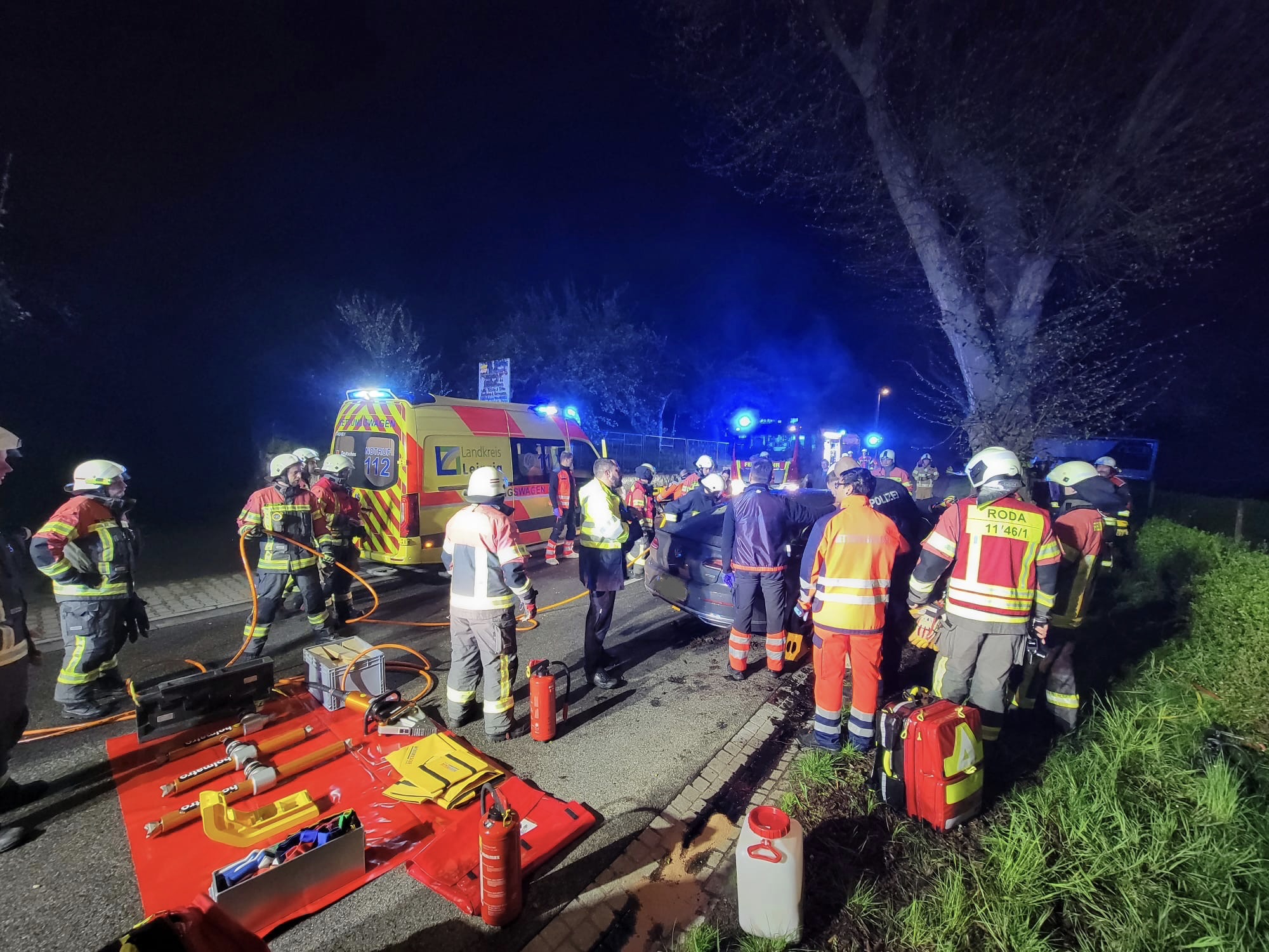 Datum/Uhrzeit: Einsatzort: Einsatzleiter: Kräfte und Mittel: Weitere Kräfte: Bericht: Am frühen Morgen kam es in der Ortslage Roda zu einem schweren Verkehrsunfall. Ein PKW kam aus bislang ungeklärter Ursache von der Fahrbahn ab und prallte mit erheblicher Wucht gegen einen Baum. Durch den Aufprall wurden drei Insassen schwer verletzt und in dem stark deformierten Fahrzeug eingeschlossen. In enger Zusammenarbeit mit der Feuerwehr Roda sowie dem Rettungsdienst erfolgte zunächst die medizinische Erstversorgung der verletzten Personen noch im Fahrzeug. Unter Einsatz von zwei hydraulischen Rettungsgeräten wurden die Personen anschließend aus ihrem Fahrzeug befreit. Aufgrund der Schwere der Verletzungen wurden alle drei Patienten nach der Rettung zur weiteren Behandlung in umliegende Krankenhäuser transportiert. Desweiteren wurde der Brandschutz sichergestellt sowie die Fahrbahn gegen den fließenden Verkehr gesichert. Während der gesamten Einsatzdauer war die Rodaer Dorfstraße vollgesperrt.